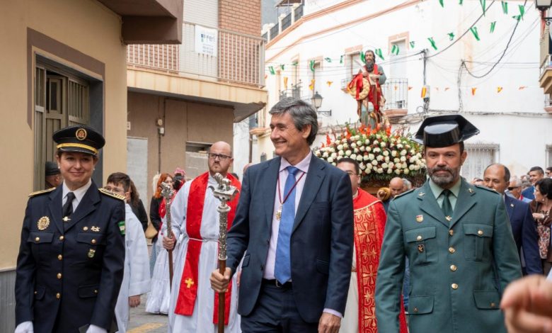 El Hermano Mayor, Antonio Ginés, junto al alcalde Manuel Cortés, han acompañado al patrón en este día tan especial, respaldados por numerosos vecinos, devotos y representantes de instituciones civiles y militares, así como miembros de la Corporación Municipal.