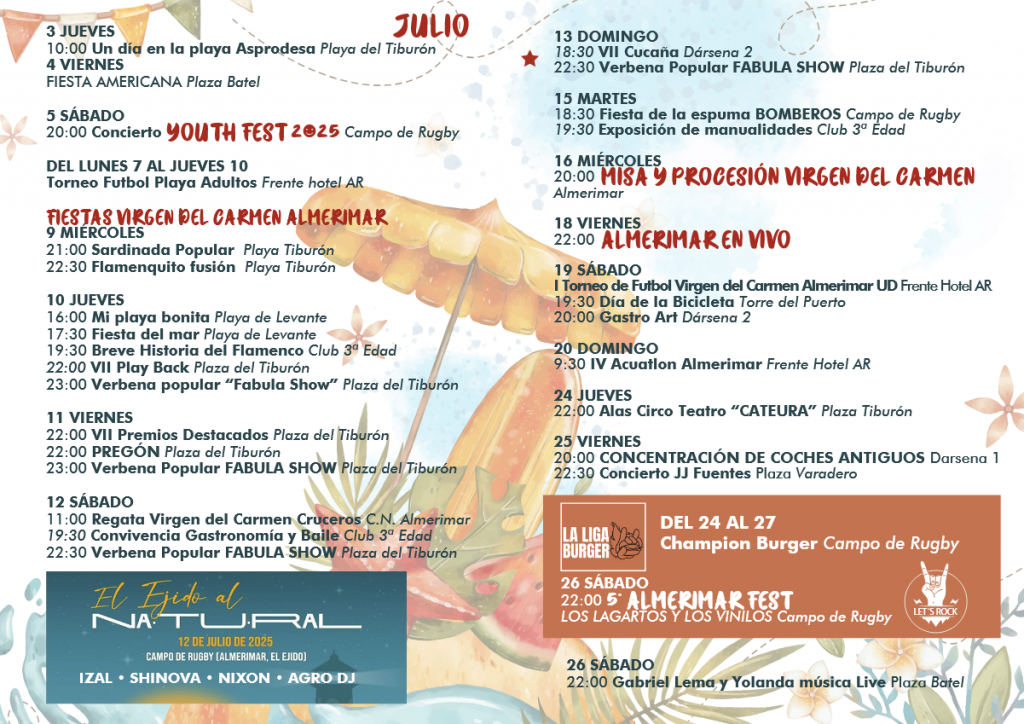 El núcleo de Almerimar celebrará hoy el pregón en la Plaza del Tiburón a cargo de Mari Carmen Saiz Reoyo, donde también se hará entrega de los VII Premios Destacados. El sábado 12 de julio tendrá lugar la Regata Virgen del Carmen, el festival ‘El Ejido al Natural’ y una convivencia gastronómica y de baile del Club de la Tercera Edad.