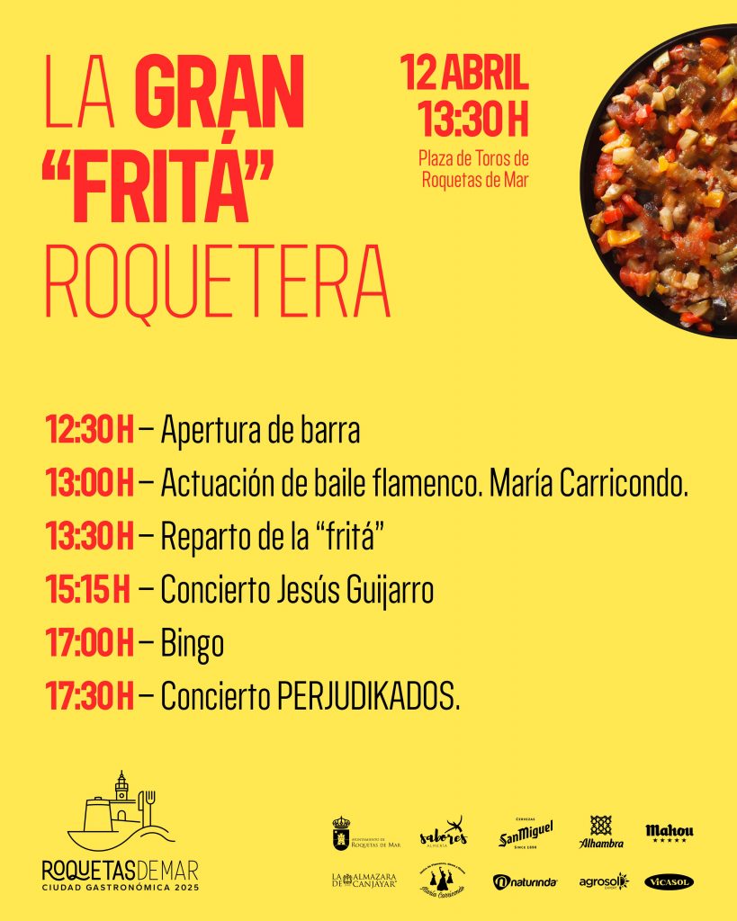 El Ayuntamiento de Roquetas de Mar, a través de la concejalía de Turismo y Playas, ha organizado la Gran Fritá roquetera que se celebrará el próximo sábado 12 de abril en la Plaza de Toros de Las Salinas.
