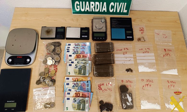 Como resultado del registro, la Guardia Civil incautó un total de 17,39 gramos de cocaína distribuidos en bolsas de 3 y 4 gramos, junto con recortes de plástico destinados a la preparación de las dosis. Asimismo, se intervinieron 402 gramos de hachís en tabletas de aproximadamente 100 gramos, además de varios fragmentos obtenidos de la extracción de las dosis. También se localizaron varias setas alucinógenas, 412 euros en efectivo y cinco básculas de precisión.