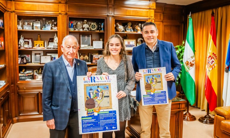 El alcalde de Roquetas de Mar, Gabriel Amat, junto con el concejal de Cultura, Daniel Salcedo, han presentado el cartel anunciador del Carnaval de Roquetas 2024.  Se trata un diseño de Maria del Mar Sánchez Acevedo, diseñadora roquetera que ha intentado plasmar la fiesta del Carnaval con señas de identidad del municipio como el Faro de Roquetas de Mar o el Castillo de Santa Ana.