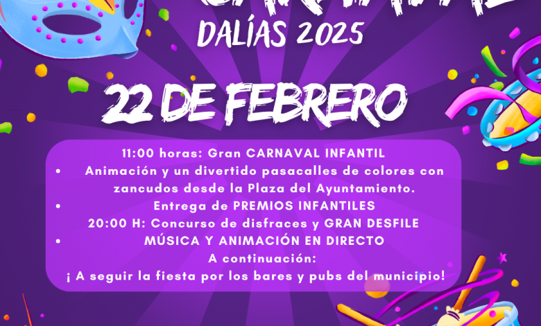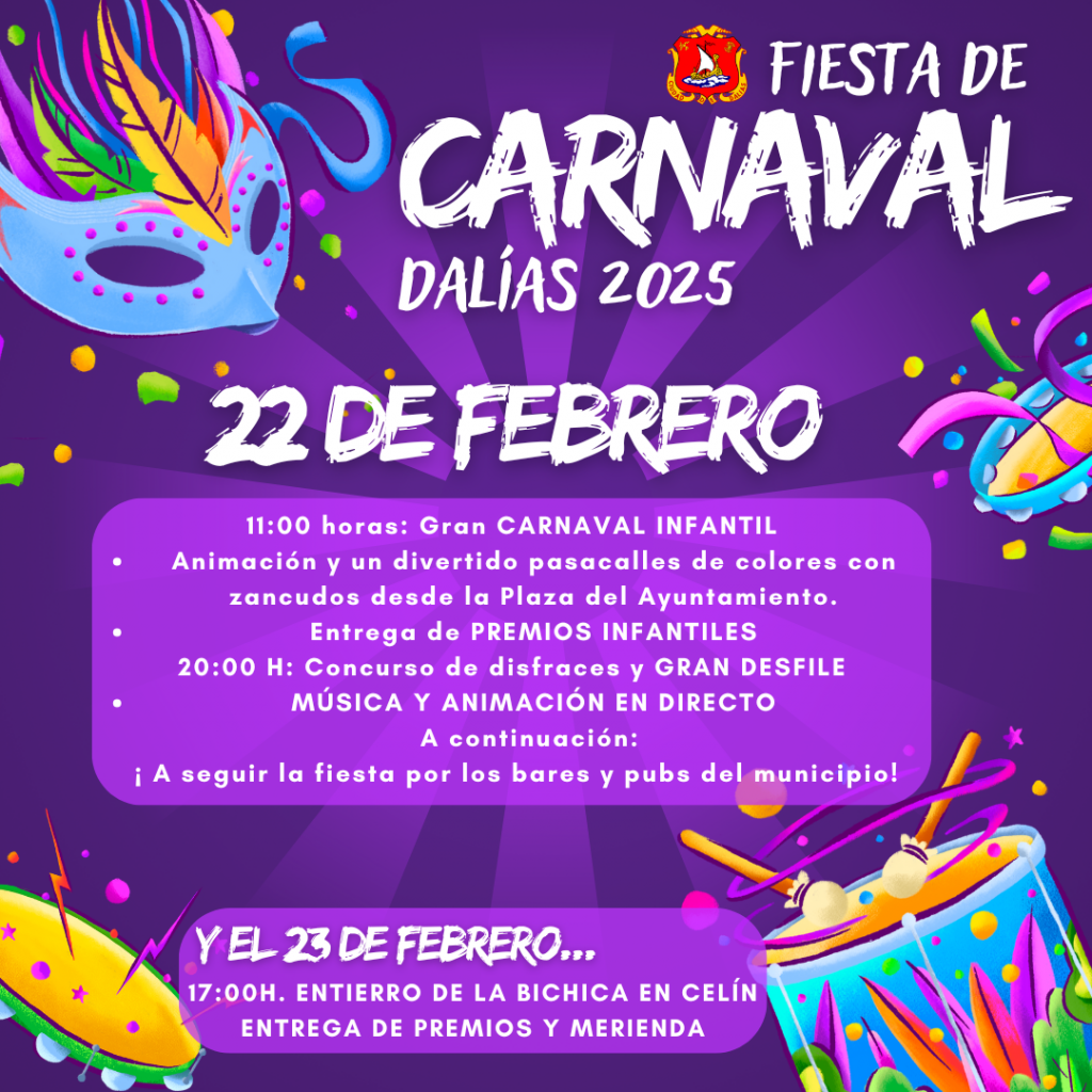 La concejalía de Cultura del Ayuntamiento de Dalías ya ha dado a conocer la programación oficial del Carnaval Dalías 2025 y las bases de los concursos que este año se celebrará los días 22 y 23 de febrero “para llenar las calles del municipio de música, color, alegría y un gran ambiente”, comienza explicando el alcalde, Francisco Lirola.