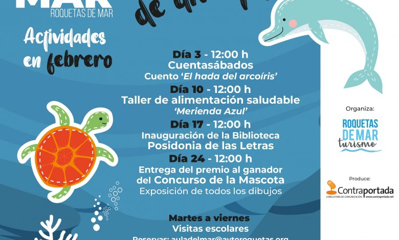 El Aula del Mar de Roquetas de Mar estará llena de historias para compartir los niños y niñas con sus familias durante el mes de febrero, y, por ende, conocer un poco mejor la relación del municipio con el medio marino. Éstas se contarán a través de un divertido cuentacuentos, un taller para preparar una merienda azul saludable, la apertura de la biblioteca Posidonia de las Letras y la exposición de los dibujos que se han presentado al concurso de la mascota, así como el anuncio del ganador.