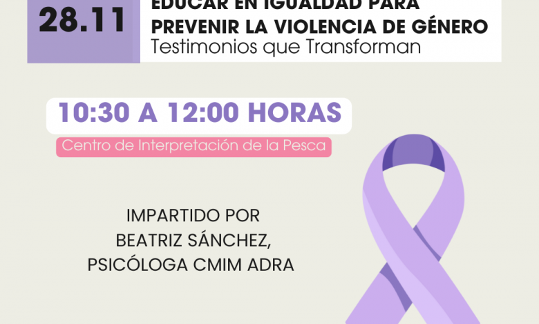 La Escuela de Familia de Adra se despide este viernes, 28 de noviembre, con un coloquio en el marco del Día Internacional de la Eliminación de la Violencia contra la Mujer, que se conmemora cada 25 de noviembre (25N). Bajo el título ‘Educar en Igualdad para Prevenir la Violencia de Género: Testimonios que Transforman’, será impartido por la psicóloga del Centro Municipal de Información a la Mujer (CMIM), Beatriz Sánchez, en el Centro de Interpretación de la Pesca, de 10:30 a 12:00 horas.