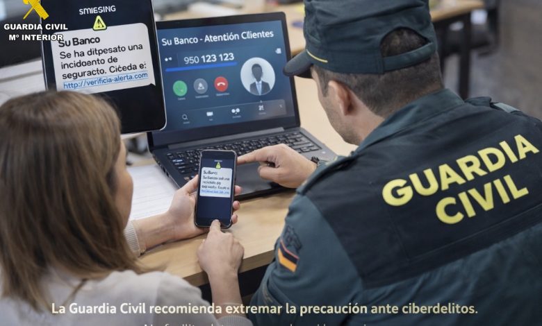 La Guardia Civil de Almería informa del aumento detectado en la provincia de estafas tecnológicas bajo las modalidades conocidas como “smishing” y “spoofing”, consistentes en la suplantación de identidades de entidades bancarias con el objetivo de obtener datos personales y credenciales bancarias de las víctimas.