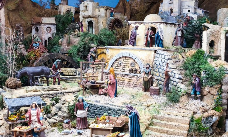 La muestra recrea episodios representativos del nacimiento de Jesús, como la adoración de los Reyes Magos, integrados en un entorno que refleja la vida cotidiana de la época. Entre los elementos más destacados se encuentran un molino en funcionamiento y el sonido del agua, que aportan realismo y dinamismo al conjunto.