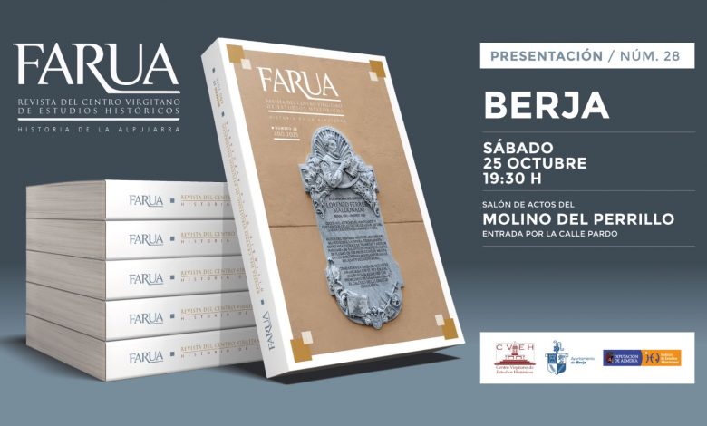 Este sábado 25 de octubre, a las 19:30 horas, se celebrará la presentación del número 28 de la revista Farua en el salón de actos del Molino del Perrillo, con entrada por la calle Pardo. Un acto organizado por el Centro Virgitano de Estudios Históricos (CVEH) del Ayuntamiento de Berja y que contará con la intervención de varios de los autores que participan en esta nueva edición, quienes compartirán con los asistentes los aspectos más destacados de sus investigaciones.