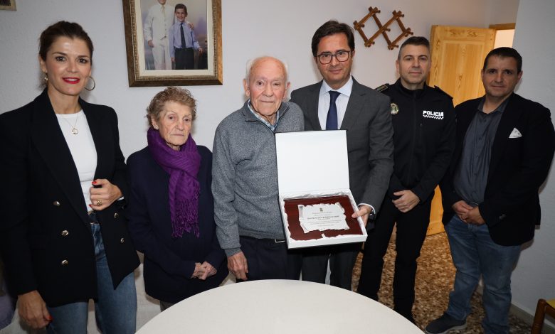 El alcalde de El Ejido, Francisco Góngora, ha visitado hoy en su domicilio de Santa María del Águila a uno de los pioneros de la Policía Local del municipio, con motivo de su 92º cumpleaños, a quien le ha entregado una placa de recuerdo y reconocimiento.