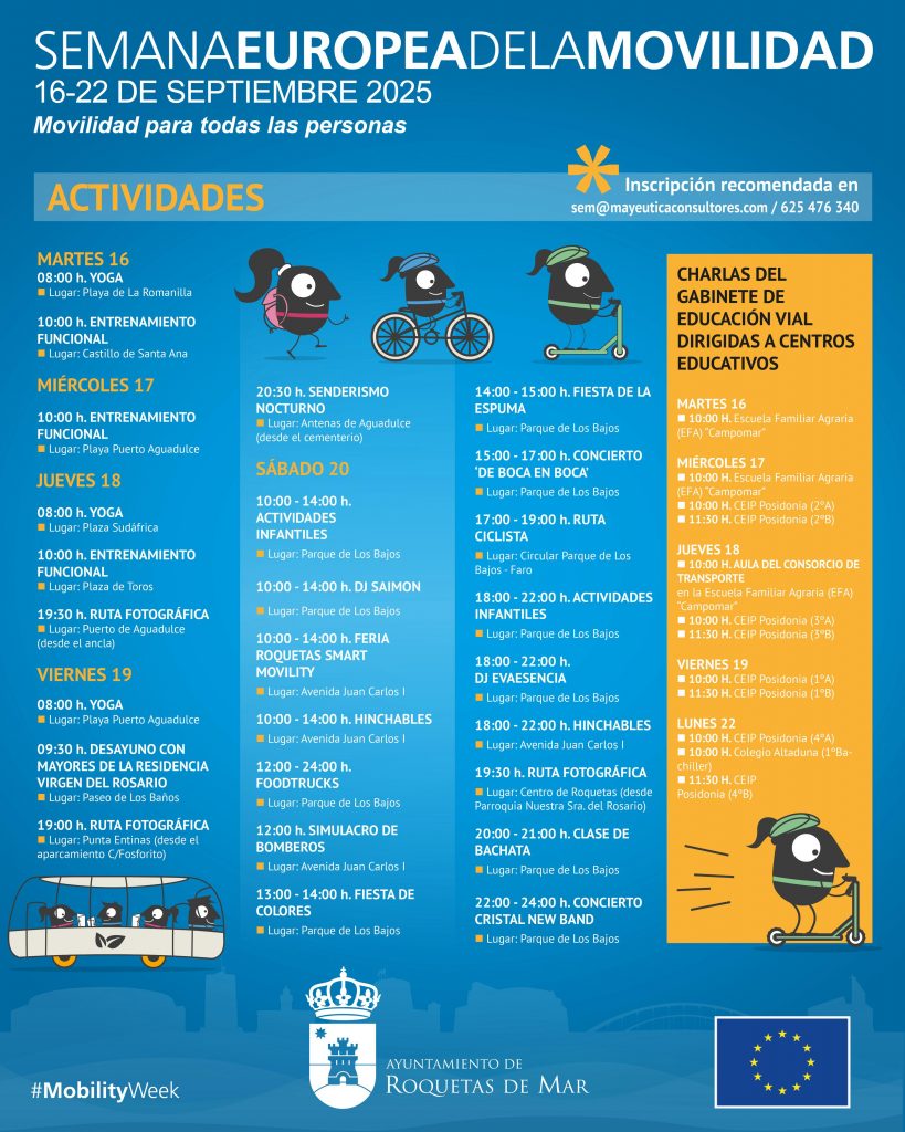 El Ayuntamiento de Roquetas de Mar, a través de la concejalía de Movilidad y Tráfico, se suma un año más a la Semana Europea de la Movilidad, que tendrá lugar del 16 al 22 de septiembre, bajo el lema elegido por la Comisión Europea para esta edición: “Movilidad para todas las personas”.