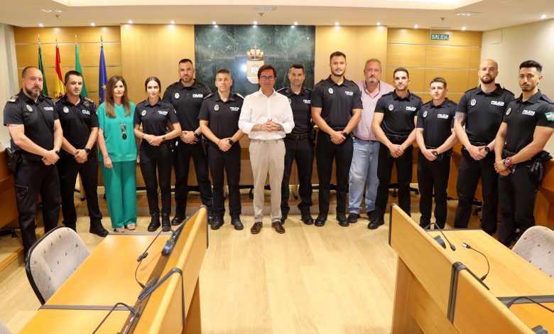 El Ejido, 8 de julio de 2024.- El alcalde de El Ejido, Francisco Góngora, junto al Intendente, Marco Muñoz, ha recibido a los ocho funcionarios en prácticas que desde hoy se incorporan a la Plantilla de Policía Local.